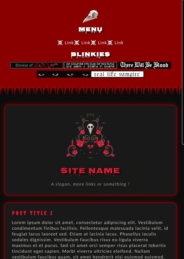 COMMENT Small halloween template. Centered. Scrollbars will appear if you put enough text in the sidebars and content section. Header font is "Creepster" from Google.