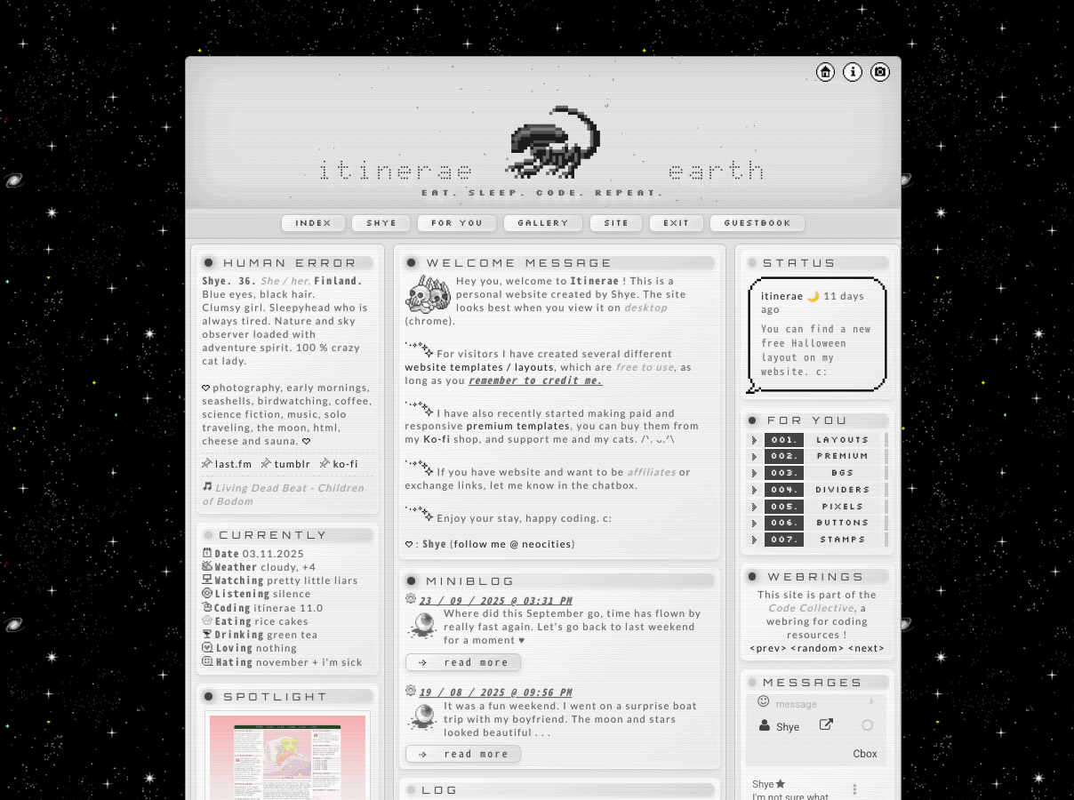 This is Itinerae. Shye's online home and a personal website. The place where I share the html x css templates I do for fun. The site is designed for desktop (chrome), but it should be now fully responsive too.